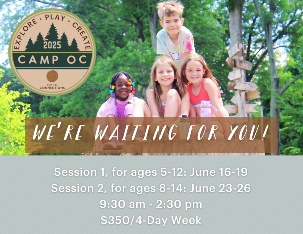 Every day at Camp OC will bring something new! We’ll be spending all of our time outside, exploring the sprawling 28 acres of Open Connections. We will have plenty to explore: investigating the ecosystem of the stream, playing capture the flag, experiencing an epic water slide, making crafts with friends, lounging on the porch swing, or spending time in the woods! Youth will be able to direct their days and experience the fun and magic that summertime outdoors can bring. Registration is open starting February 3rd, 2025 and the deadline to register is May 31st, 2025.